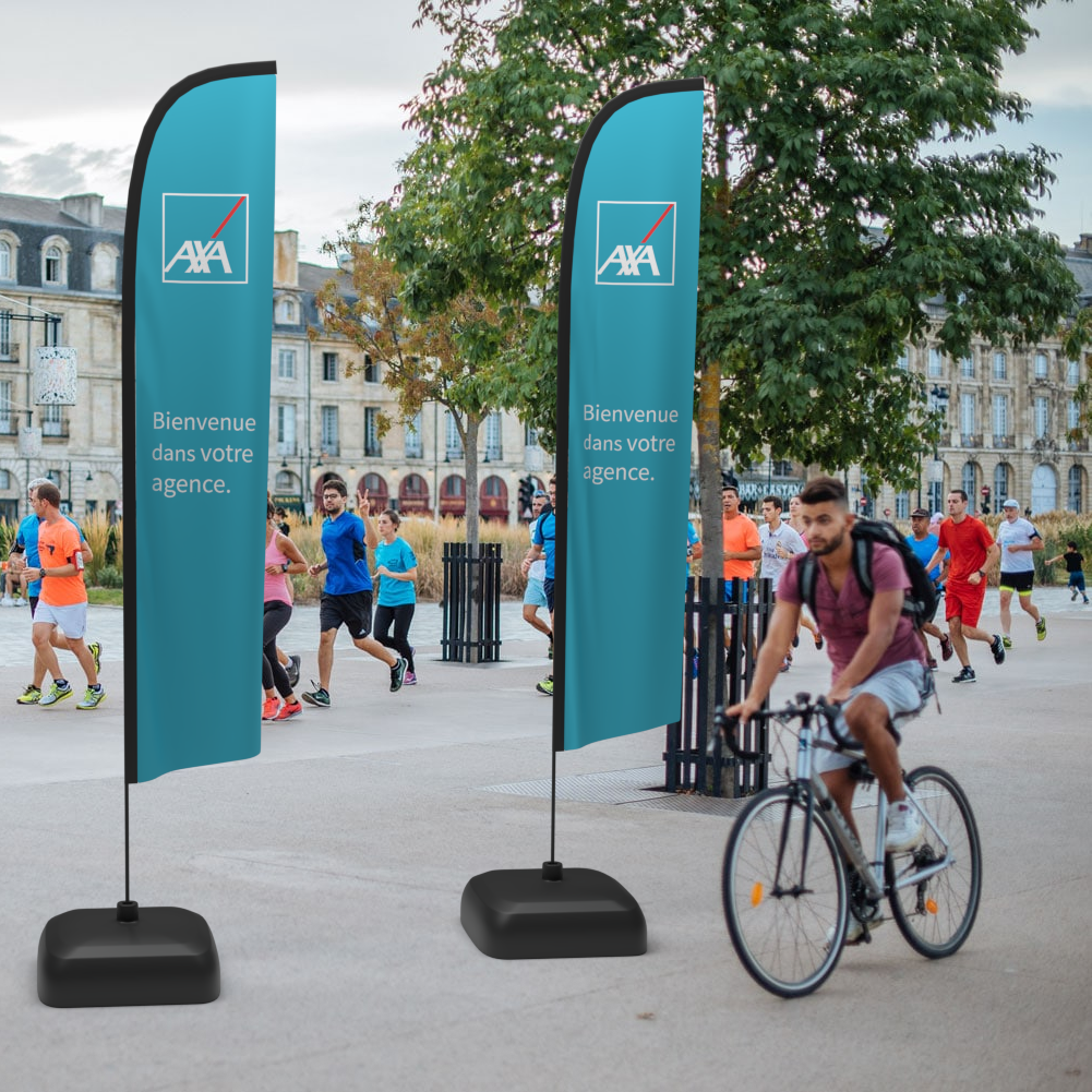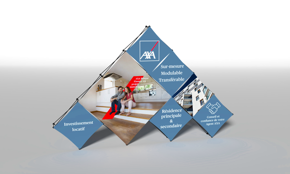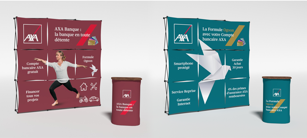 La marque Axa nous a confié sa communication opérationnelle. Nous avons ainsi fabriqué et imprimé des stands itinérants avec comptoirs, mais également des voiles publicitaires. La marque étant sponsor d’un évènement sportif, nous avons aussi réalisé l’impression de rubalise et de drapeaux publicitaires avec le logo Axa.